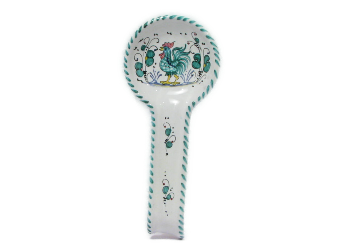 Poggia mestolo in ceramica , realizzato a mano con il decoro gallo orvietano che è uno dei decori più tradizionali e popolari della ultra centenaria produzione di Deruta